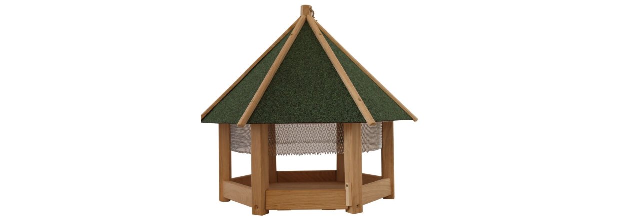 Fuglefoderhus sekskantet med tagpaptag og net.